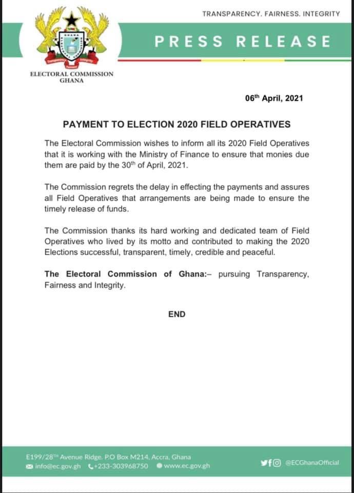 The Electoral Commission wishes to inform all its Field Operatives that it is working with the Ministry of Finance to ensure that monies due them are paid by the 30th of April.