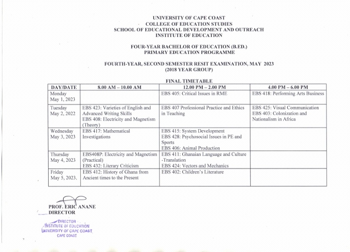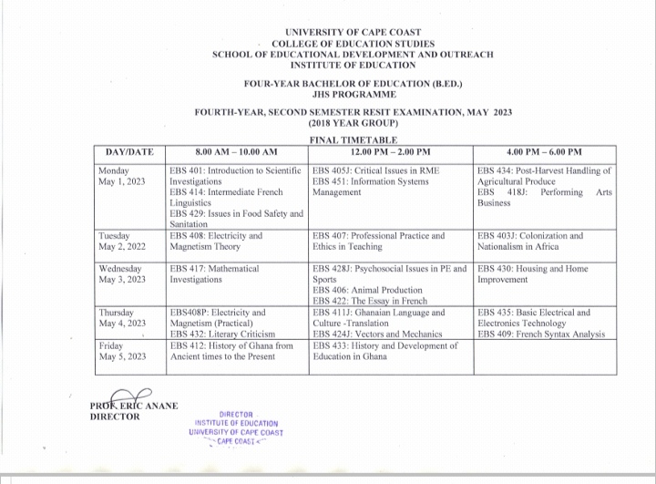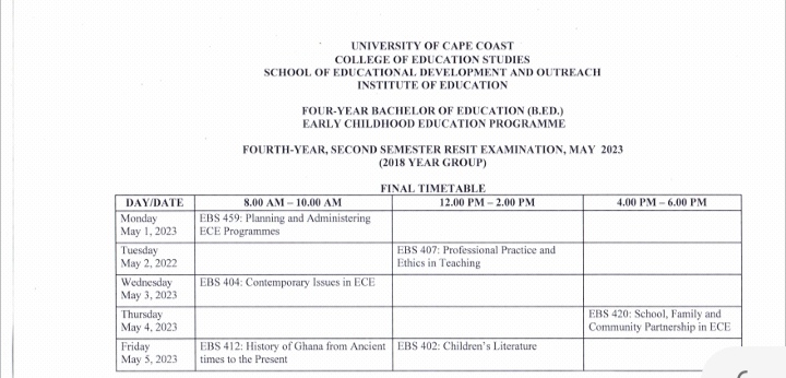 The management of University of Cape Coast (UCC), School of Educational Development and outreach Institutes of Education has release the resit Centres and timetable for the second semester examination of the 2018 year group for the institute for the 2021-2022 academic year.